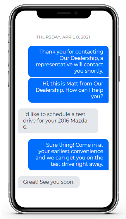 Schedule a Demo95% of text messages are opened and responded to within 3 minutes of being delivered. Generate more leads and appointments via website texting. Your customers are using one of the most responsive methods of communication possible to buy cars. Your Dealership Should Too!